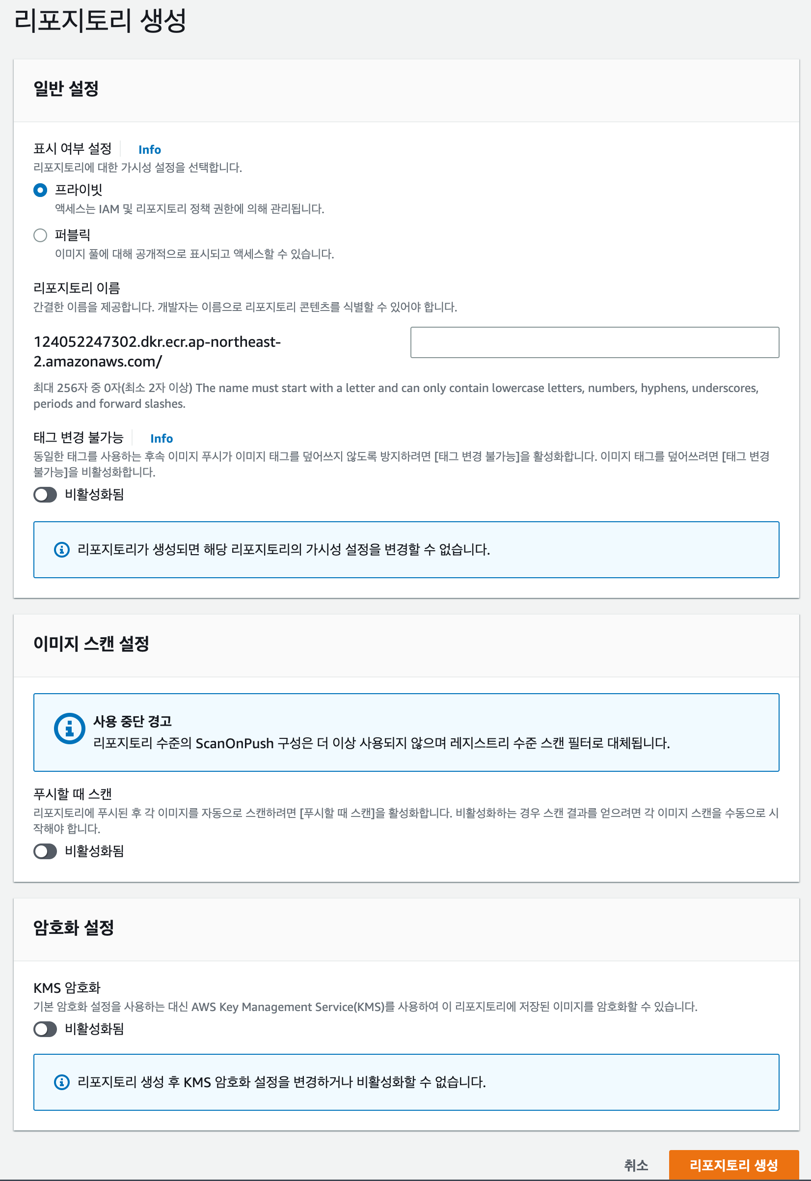 프라이빗 리포지토리를 생성해준다. (도커 이미지 저장소)
