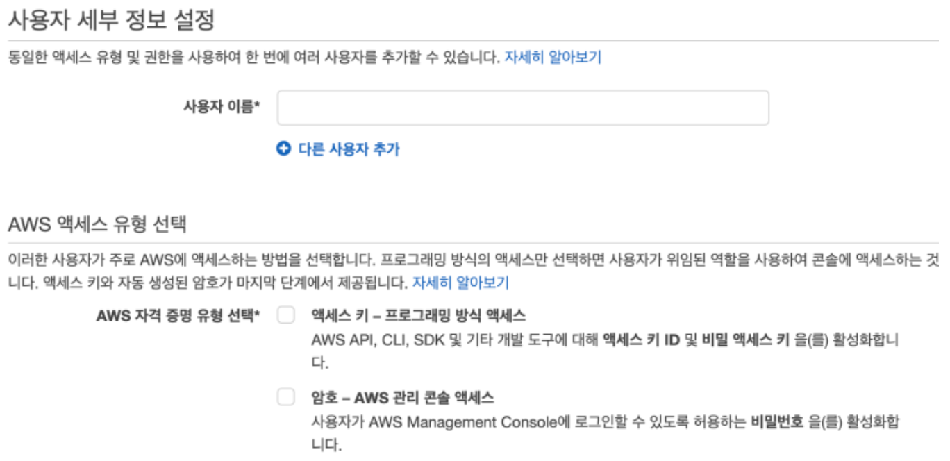 사용자 추가를 눌러 사용자를 생성해준다. 이때 액세스 키 - 프로그래밍 방식 액세스는 필수 이다.
