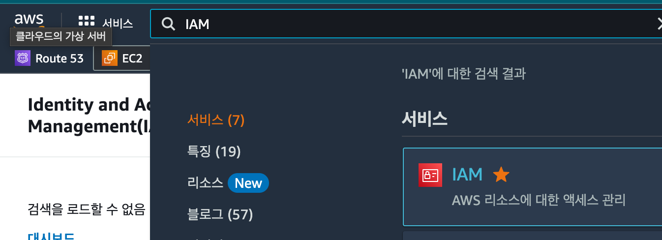 추후 EC2에서 ECR에 접근을 해야하는데 그전에 접근 권한을 가진 사용자를 생성해줘야 한다. IAM 에 접속해준다.